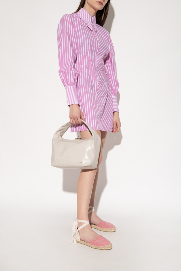 Pink, beige and white ‘Valenciana’ espadrilles from Manebi. Made of suede, this model features white grosgrain tie closures at the ankle and a natural jute sole with a thin rubber layer in beige.