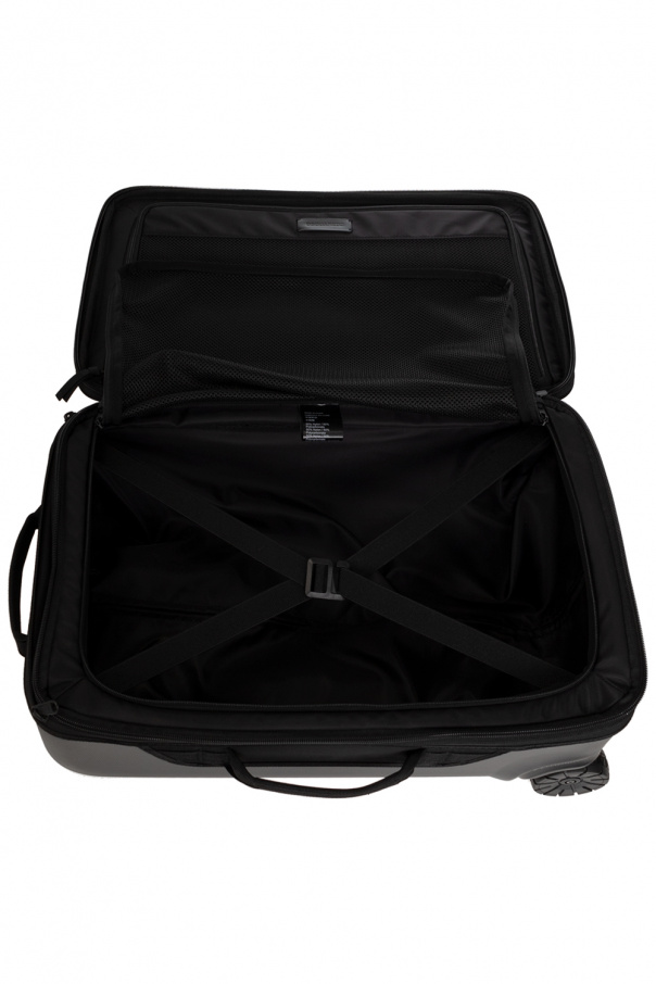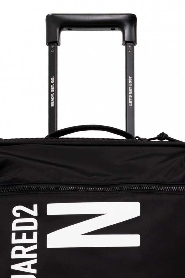 Black suitcase from Dsquared2. Made of nylon, this design secures with a two-way zip and showcases a tactile logo and a printed white logo. It is complete with an external zip pocket on the front, three handles (one is adjustable), two wheels and one internal compartment with a zip pocket.