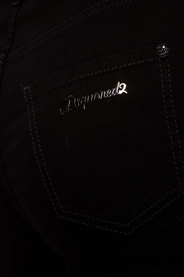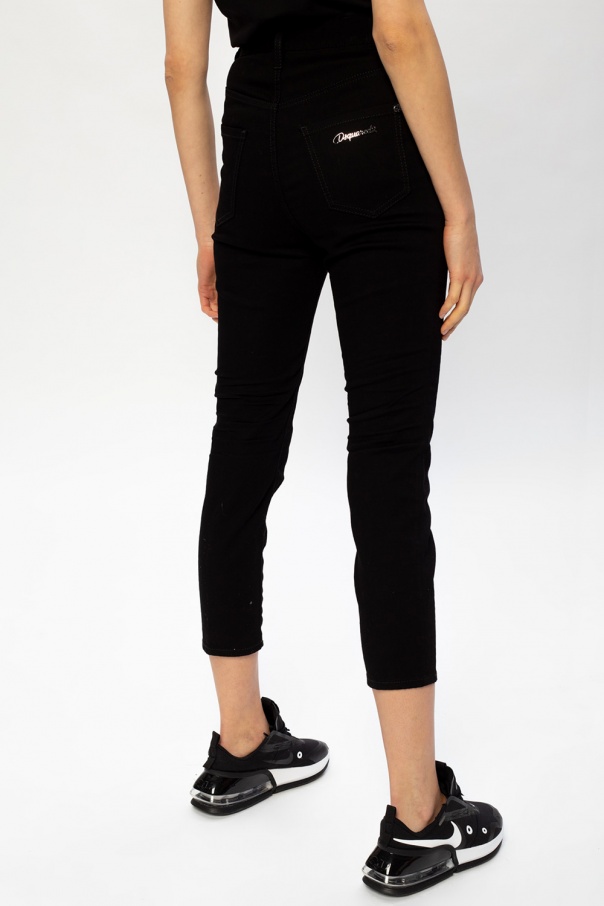 Black \'High Waist Twiggy Jean\' jeans from Dsquared2. Falling down with tapered legs, this pair features zip and button fastenings and five classic pockets. Decorative appliqués, branded metal plaque and a logo embroidery complete this look.