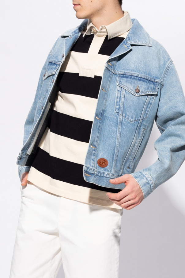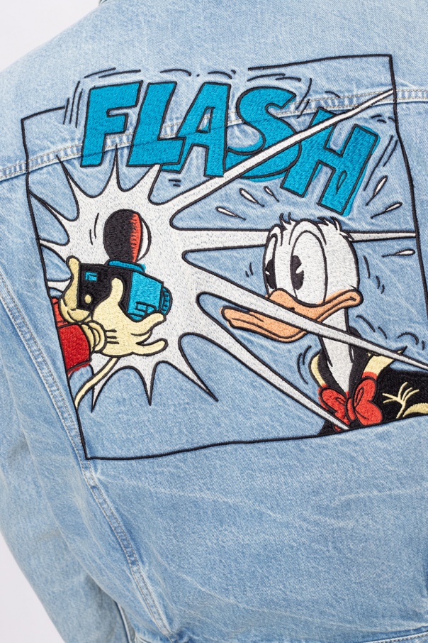 Blue denim jacket from Gucci x Disney. Fastened with buttons, this garment features two slip pockets, two buttoned flap pockets and a colorful embroidered motif.