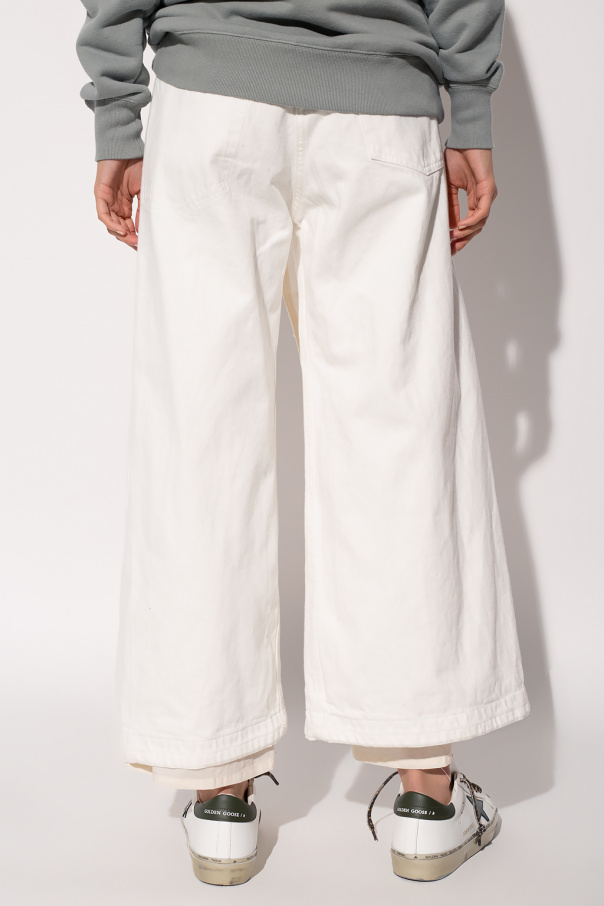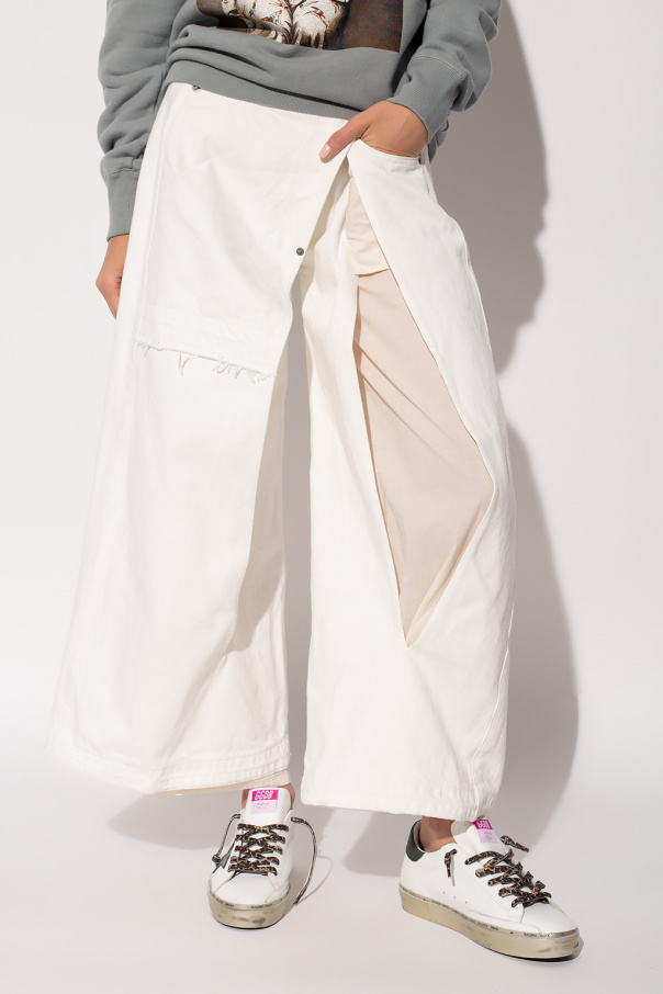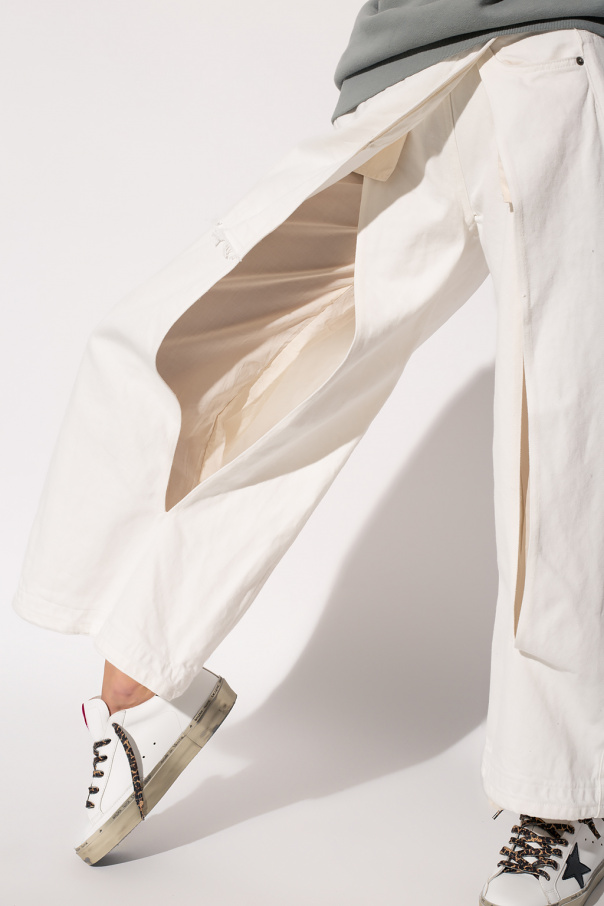 White jeans from Undercover. Cut with an asymmetrical silhouette, this pair falls down with flared legs and features button fastenings, classic five pockets, raw hems and cut-out details.