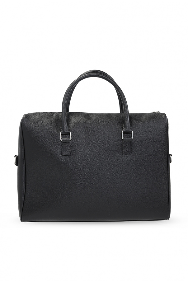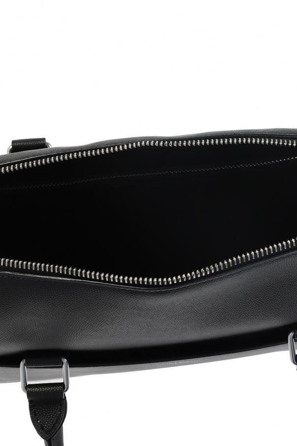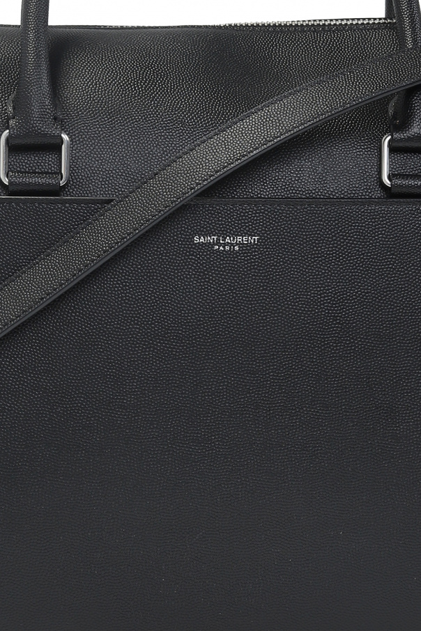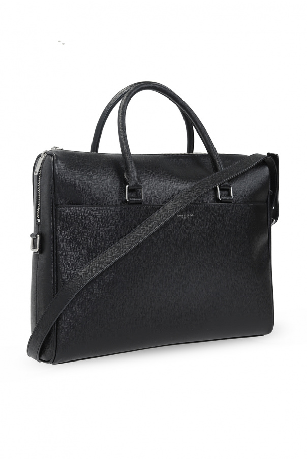 Black briefcase from Saint Laurent. Crafted from calf leather, this design fastens via a zip and showcases a silver-tone logo print, an external pocket with a magnetic closure on the front, two half-round handles, a detachable and adjustable shoulder strap, silver-tone metal hardware and one internal compartment with two slip pockets and one zip pocket.