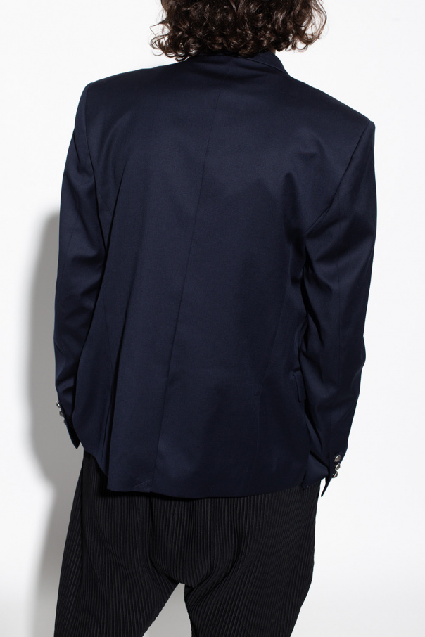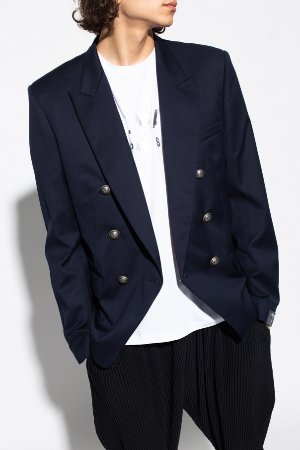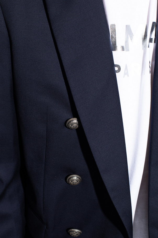 Navy double-breasted blazer with peak lapels from Balmain. Made of wool, this garment features metal logo buttons in silver-tone, two flap pockets and a single rear vent.