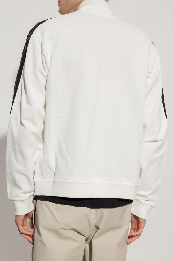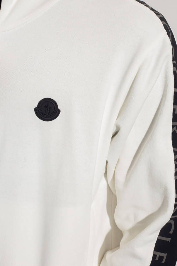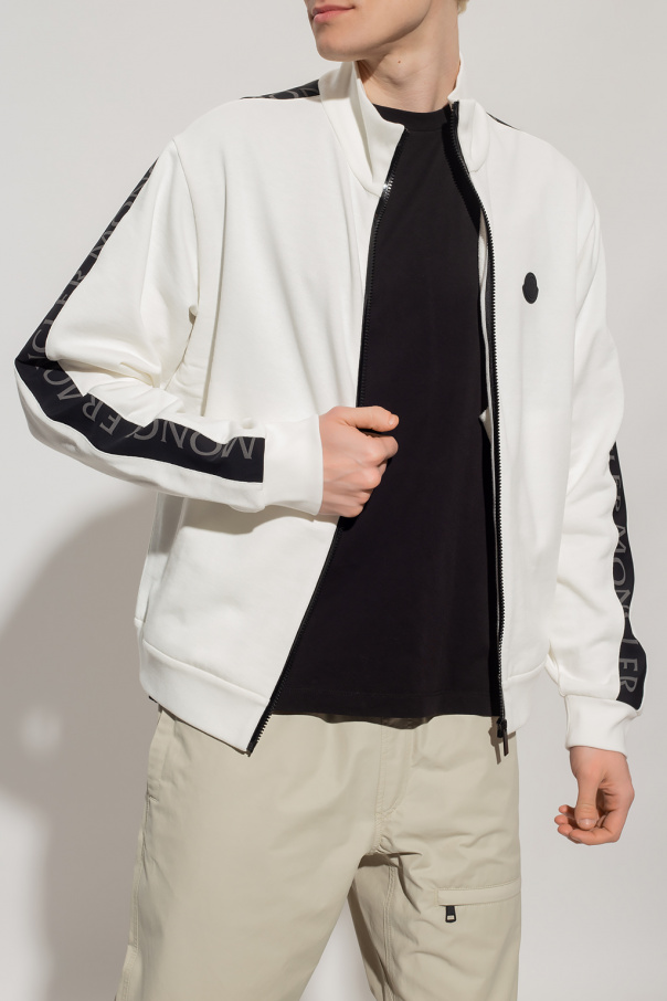 White and black sweatshirt with a stand-up collar from Moncler. Fastened with a zip, this garment features a logo patch, stripe with a reflective logo print, two zip pockets and ribbed trims at the hem and cuffs.