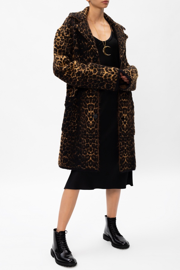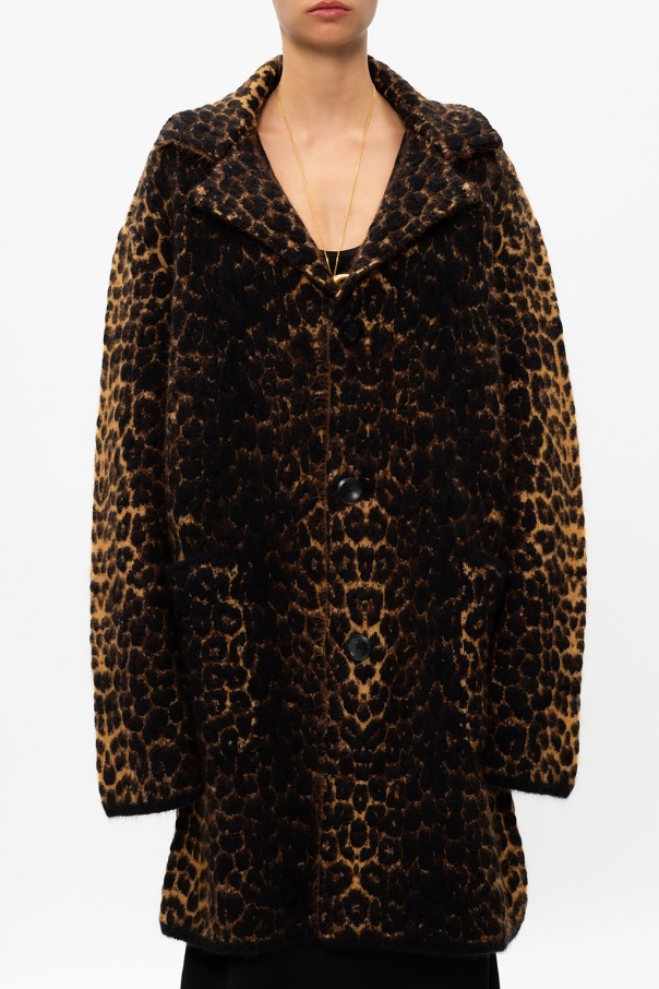 Brown and black coat from Saint Laurent. Rendered in a leopard jacquard print, this wool-crafted piece of outerwear has logo-embossed buttons and two slip frontal pockets.