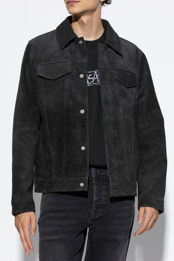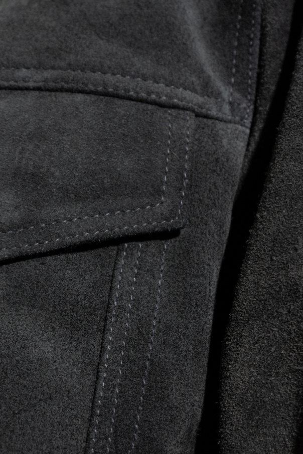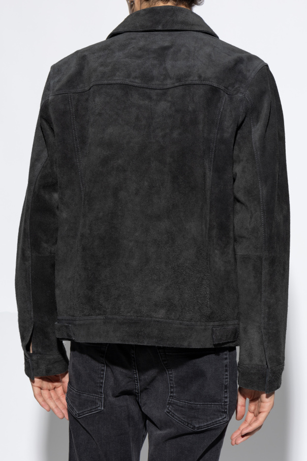 Introducing the Hopper Jacket from the esteemed AllSaints collection. This sophisticated garment epitomizes the quintessence of elegant minimalism, meticulously crafted to elevate your sartorial repertoire. Designed with a classic rectangular silhouette, this jacket features long sleeves and is fashioned from exquisite suede, conferring an air of refined luxury. The monochromatic, solid gray hue accentuates its minimalist appeal, while the juxtaposition of contrasting stitching imbues the piece with a distinct character. The jacket is adorned with a straightforward yet iconic collar and fastens securely with buttons along the front. Practicality meets aesthetics with two chest pockets, each adorned with flaps and secured by buttons, providing both functionality and a touch of refined detail. Why Choose This Product? Timeless Design: Classic rectangular cut with long sleeves for a universally flattering fit. Premium Material: Crafted from high-quality suede for a luxurious feel and appearance. Functional Elegance: Features two chest pockets with flaps, secured by buttons for added utility. Meticulous Craftsmanship: Contrasting stitching highlights the jacket’s superior construction. Versatile Style: The gray hue and minimalist design make it a versatile addition to any wardrobe.