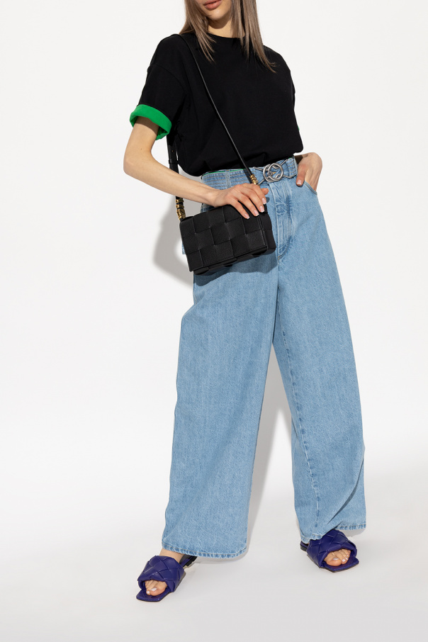 Dark purple ‘Lido’ slides from Bottega Veneta. Made of lamb leather with the iconic Intreccio weave, this square toe design has an open and heel toe as well as rubber-injected leather outsole in beige and black.