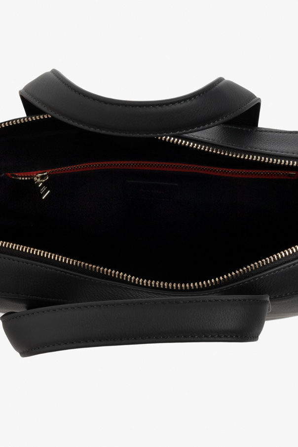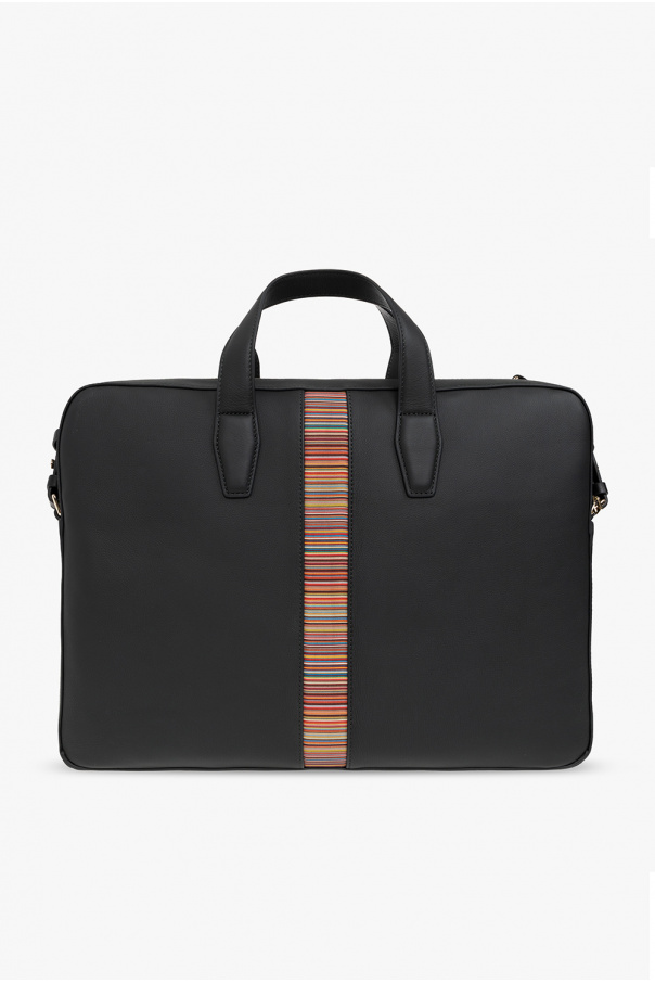 Dark green briefcase from Paul Smith. Made of leather, this model is complete with a two-way zip, the label’s signature multicolored stripe, two half-round handles, detachable and adjustable fabric strap in black, light gold-tone metal hardware and one internal compartment with three slip pockets and one zip pocket.