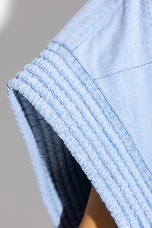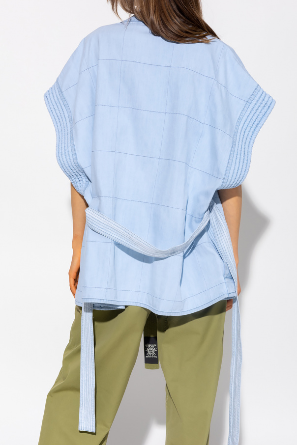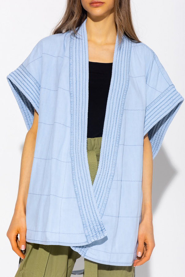 Light blue denim jacket from Stella McCartney. Crafted from organic cotton, this style features a kimono-inspired silhouette with a waist-cinching belt with a logo patch, exposed stitching details, two slip pockets and quilted details one the neckline and short sleeves.