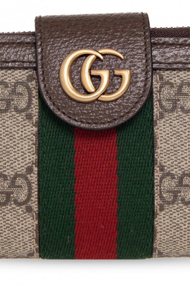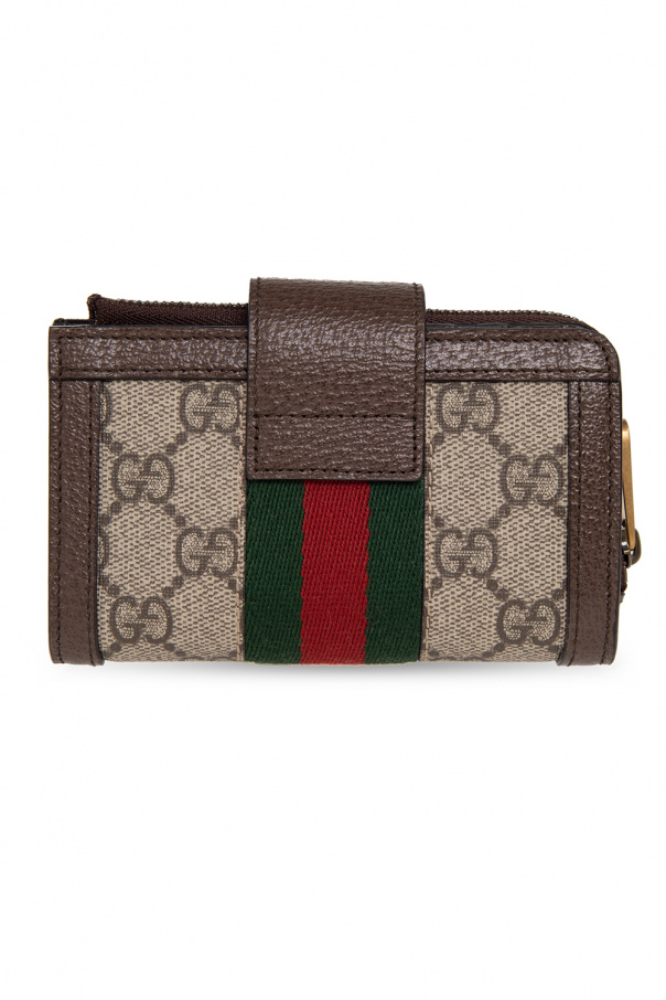 Brown and beige wallet from Gucci. Made of GG Supreme canvas with leather trims, this model features a snap closure, green and red Web stripe, metal logo appliqué and antique gold-tone metal hardware. It has a zipped coin pocket, two slip pockets and eight card slots inside.