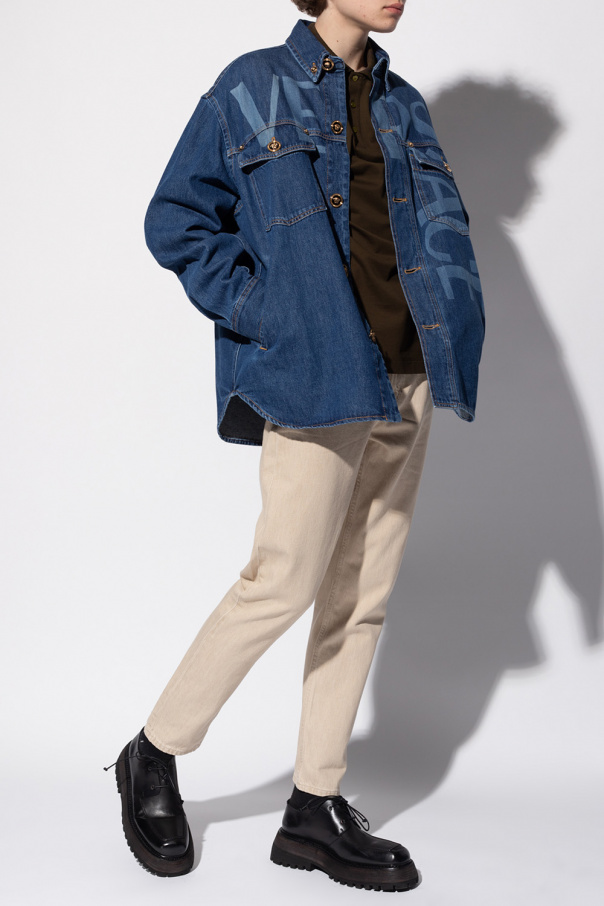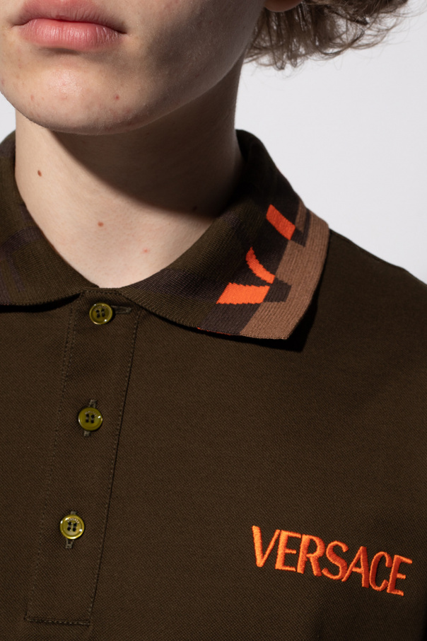 Green and orange polo shirt from Versace. Made of cotton, this short sleeve design features an orange logo embroidery on the front as well as a green, black and beige collar with a logo embroidery and button fastenings.