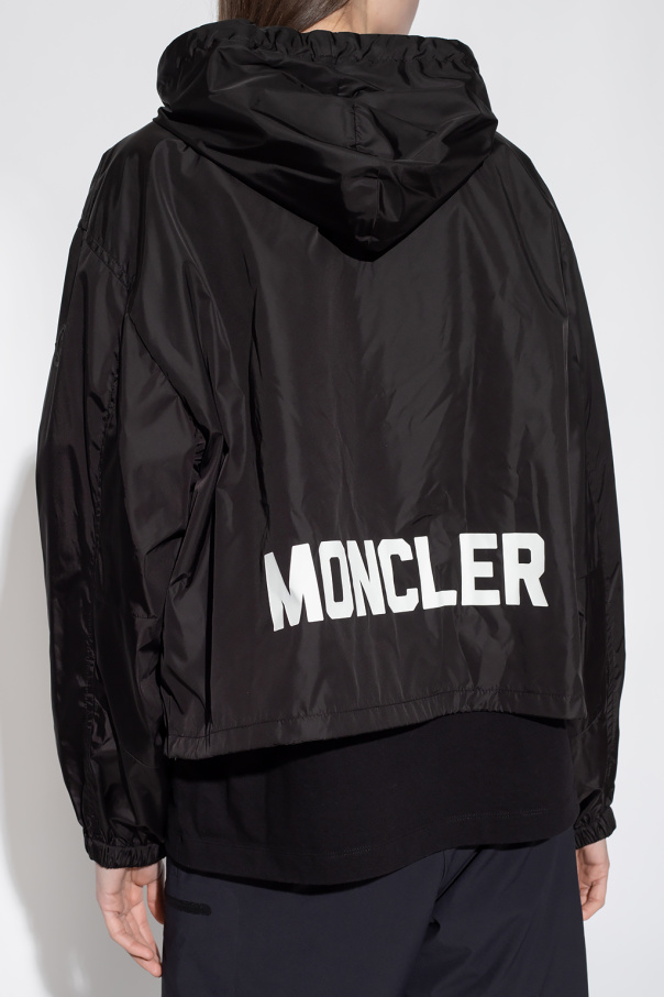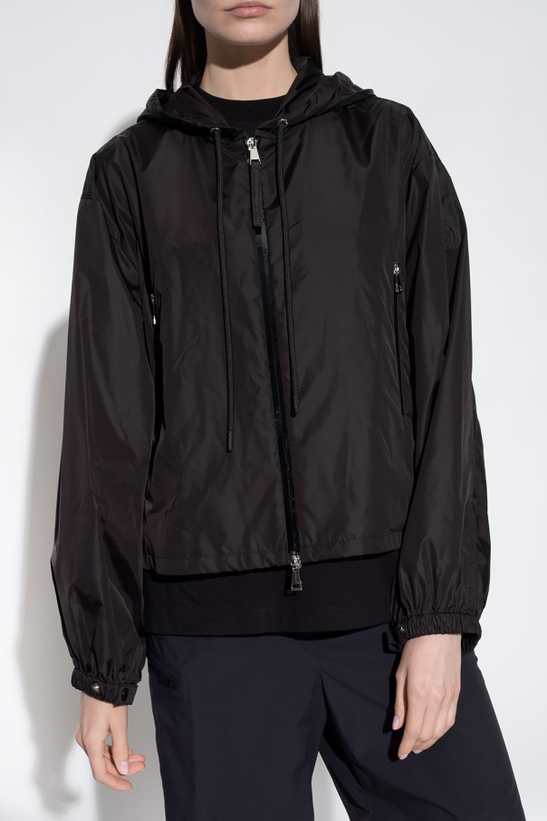 Black ‘Vernois’ jacket from Moncler. Fastened with a two-way zip, this garment features a logo-embossed patch, drawstring hood, two zip pockets and long sleeves.