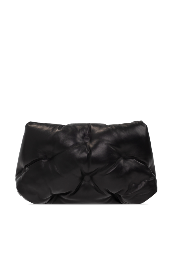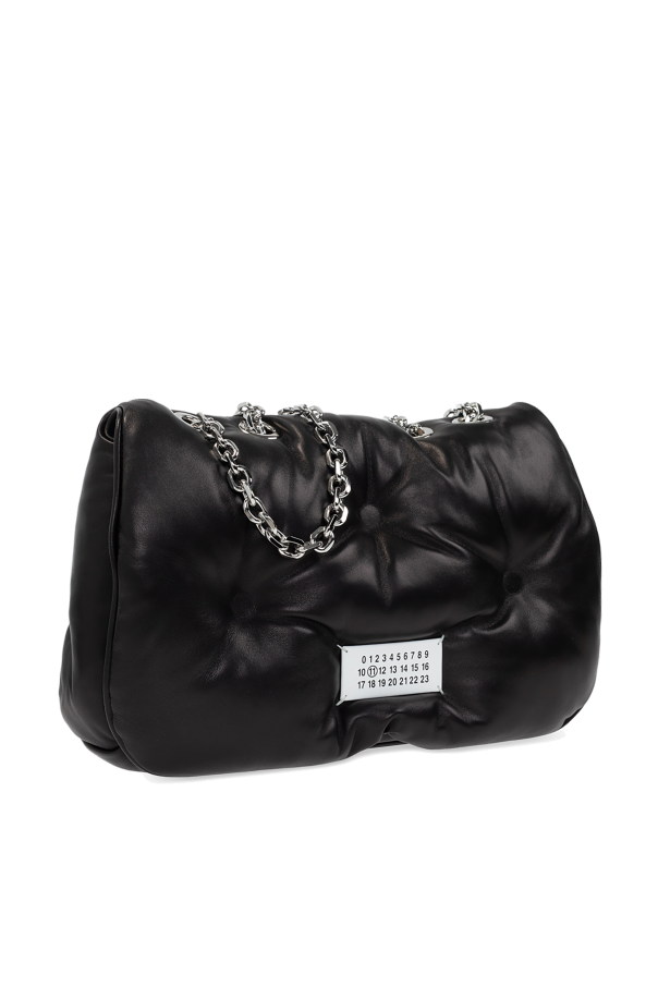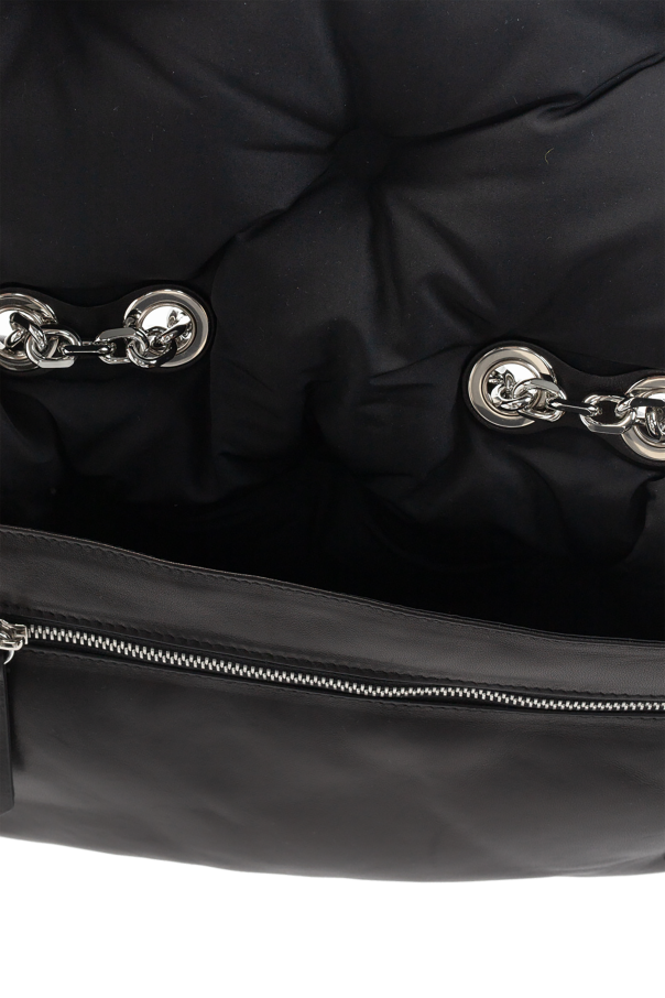 Black quilted ‘Glam Slam’ shoulder bag from Maison Margiela. Crafted from leather, this model features magnetic snaps, white logo appliqué, long chain braided with leather, silver-tone metal hardware and one internal compartment with one zip pocket and one slip pocket.