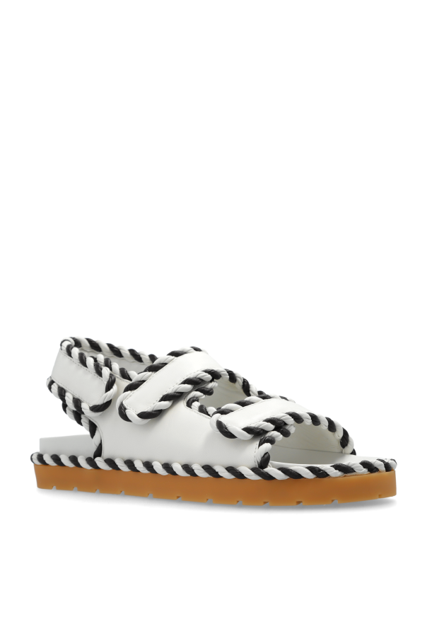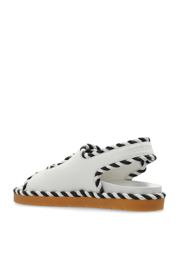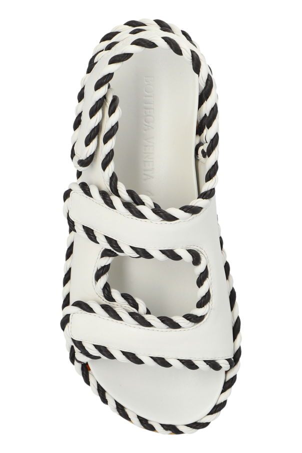 Introducing the \'Jack\' sandals by Bottega Veneta, an epitome of understated elegance and meticulous craftsmanship. These chic flat sandals, rendered in a pristine white, are accentuated by black braided or twisted pattern highlights, encapsulating a blend of sophistication and artisanal beauty. The sandals boast a construction of luxurious lamb leather, known for its smooth texture and exceptional durability, ensuring both comfort and style. The intertwined straps not only contribute to the aesthetic appeal but also provide secure and stable support for the foot. A distinct feature is the light brown rubber sole, outlined with darker stripes, offering a stark contrast and enhancing the overall design. Adding a mark of exclusivity, the interior bears the signature logo of Bottega Veneta, signifying its authenticity and high-end lineage. Designed for the fashion-forward, these sandals exemplify casual elegance, making them a versatile addition to any summer wardrobe. Moreover, the convenience of Velcro fastenings ensures ease of wear, blending functionality with luxury. Why Purchase the \'Jack\' Sandals? Unparalleled craftsmanship using high-quality lamb leather. Unique braided design with contrasting black accents. Comfortable and stable wear with a flat, rubber soled construction. Emblematic Bottega Veneta logo showcasing designer prestige. Effortless style and functionality with Velcro fastening.