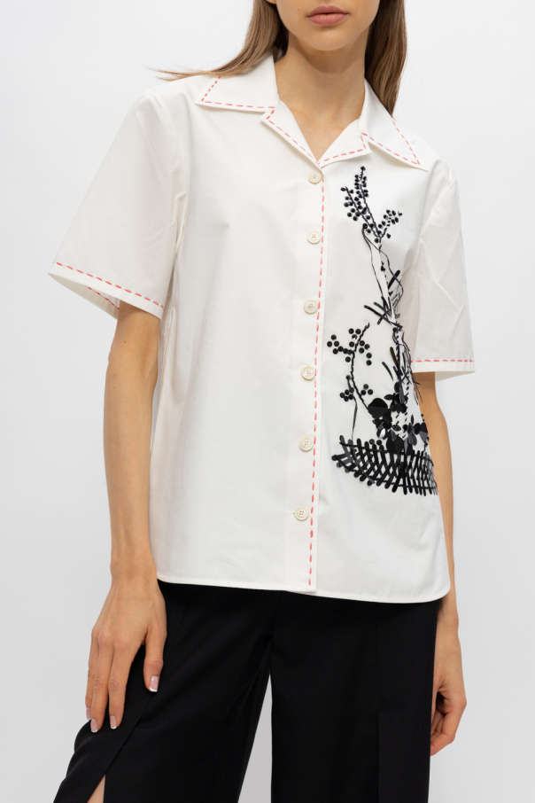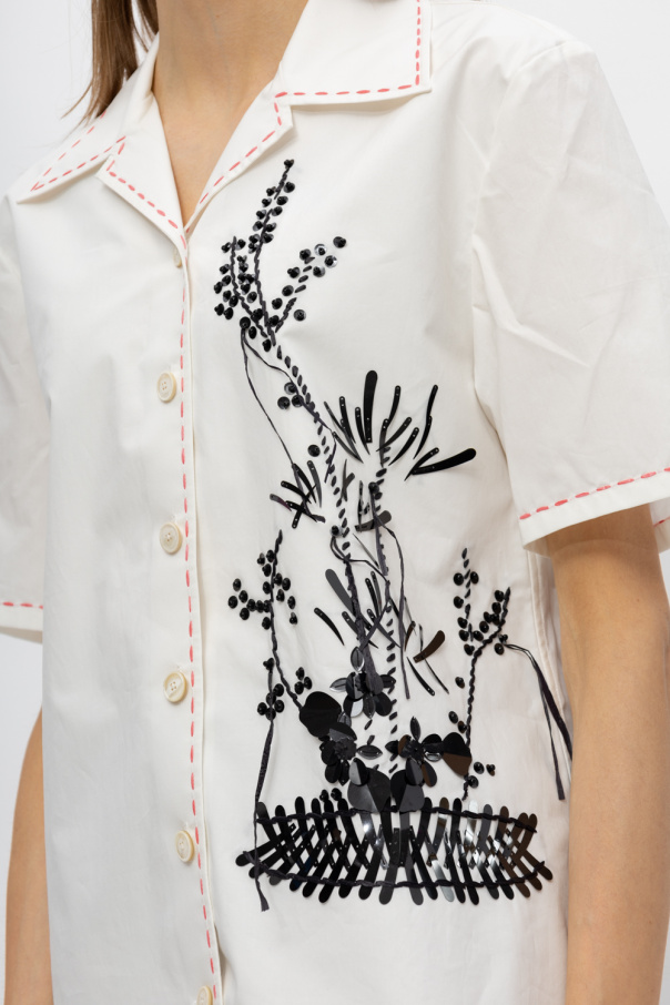 White shirt with short sleeves from Tory Burch. Made of cotton, this garment features button fastenings, decorative sequin appliqués in black and contrasting red stitching at the collar, front and cuffs.