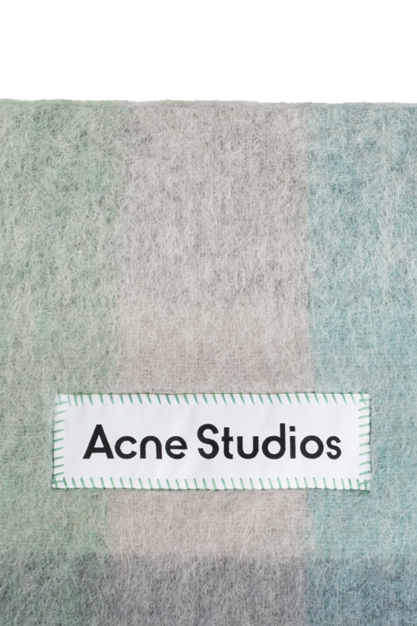 Introducing the Scarf with Logo from the exclusive collection of Acne Studios. This exquisite accessory epitomizes the epitome of Scandinavian elegance and luxury. Crafted from the finest blend of alpaca, wool, nylon, and mohair, this scarf boasts a plush, soft texture that ensures warmth and comfort. Its design features wide, horizontal stripes in pastel shades of green, gray, beige, and blue, creating a visually appealing and sophisticated look. A prominent white patch with black \"Acne Studios\" lettering, elegantly stitched with green thread, adorns the scarf, adding a touch of distinction and brand recognition. The fringe at one end, in harmonious colors matching the scarf, adds a playful yet refined detail. This scarf is a versatile unisex accessory, perfect for both men and women. It is showcased in various stylings with dark coats, highlighting its elegant and luxurious appeal. Close-up shots reveal its delicate, soft texture that promises to be a cozy addition to your wardrobe. Why Choose This Product? Exquisite blend of alpaca, wool, nylon, and mohair for ultimate warmth and softness. Elegant pastel stripe design suitable for any wardrobe. Visible Acne Studios logo patch for a touch of branded luxury. Unisex appeal, perfect for versatile styling. Fringe detailing for an added sophisticated flair.