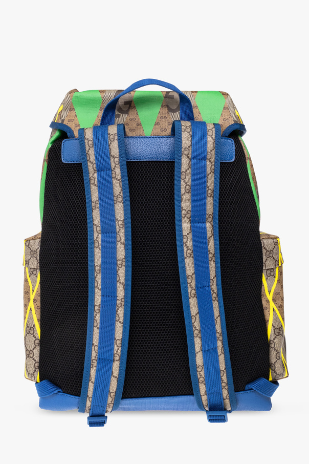 Multicolored backpack from Gucci. Made of coated canvas with a geometric and monogram pattern, this model is complete with leather trims, adjustable shoulder straps with branded buckles, zipped side pockets, top handle, adjustable shoulder straps, gold-tone metal hardware and one internal compartment with drawstrings and one zip pocket.