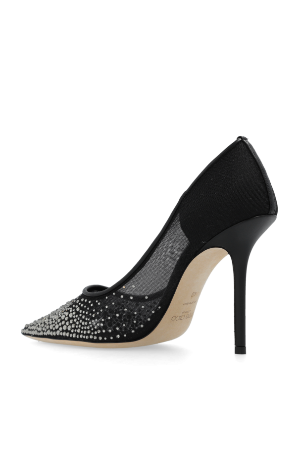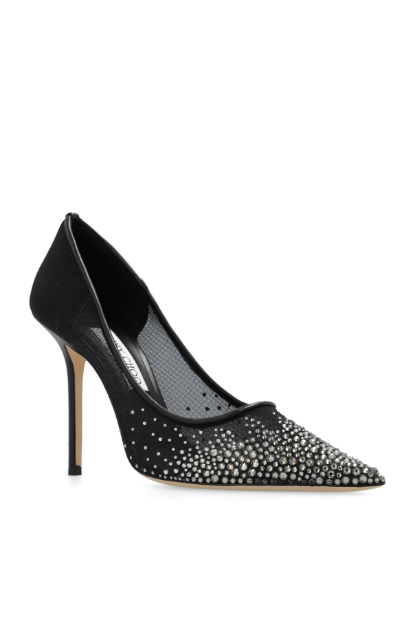 Black ‘Love’ sheer pumps from Jimmy Choo. Made of mesh with leather trims, this pair features crystals, a pointed toe and a light beige leather sole.