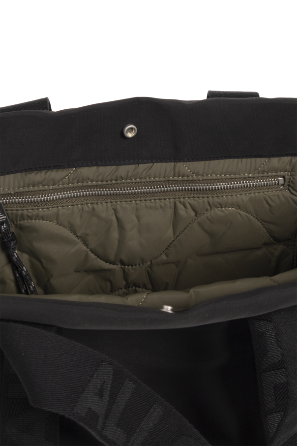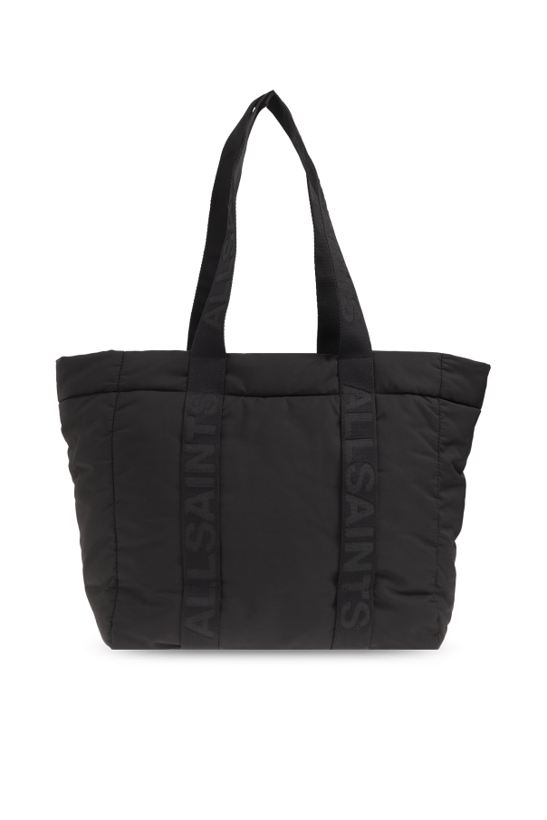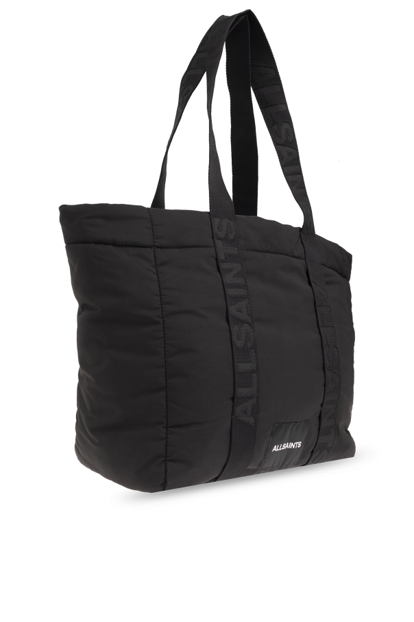 Black ‘Shore’ shopper bag from AllSaints. Made from recycled material, this design fastens via snaps and features two handles with an embroidered logo, silver-tone metal hardware and one internal compartment with one zip pocket and one card slot.