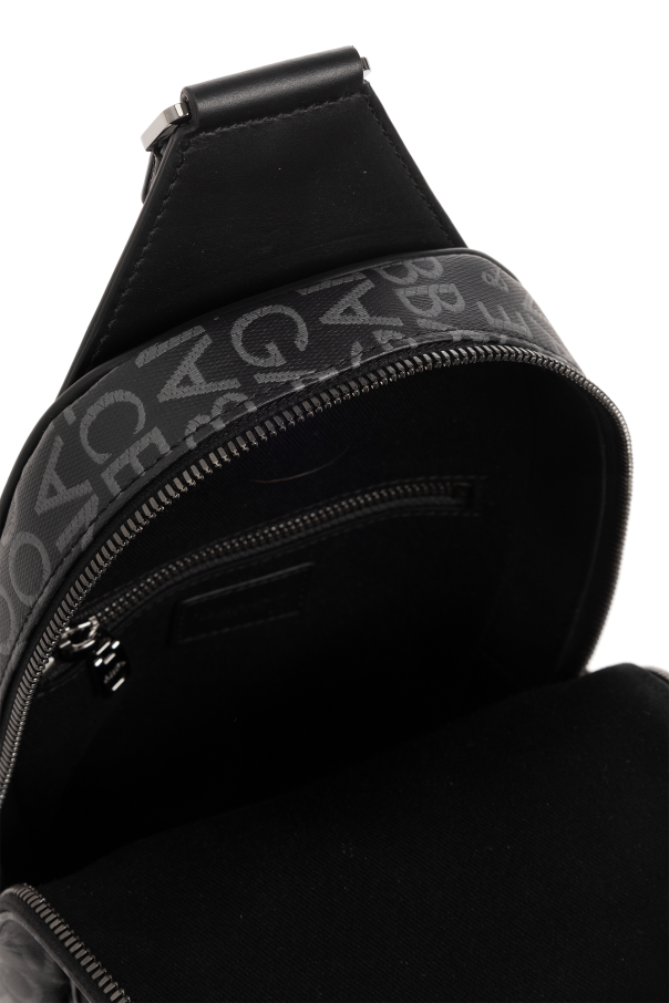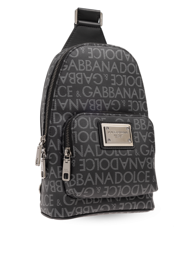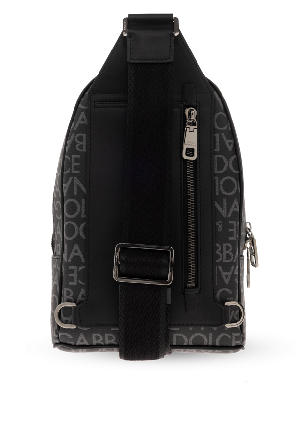 Black and grey shoulder backpack from Dolce & Gabbana. Made of fabric, this design is embellished with a logo pattern and patch and features an adjustable strap, one zip front pocket, silver-tone metal hardware and one internal compartment with a zip pocket.