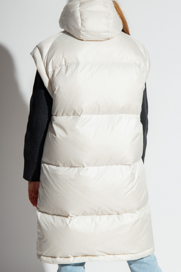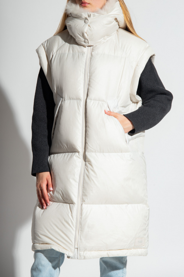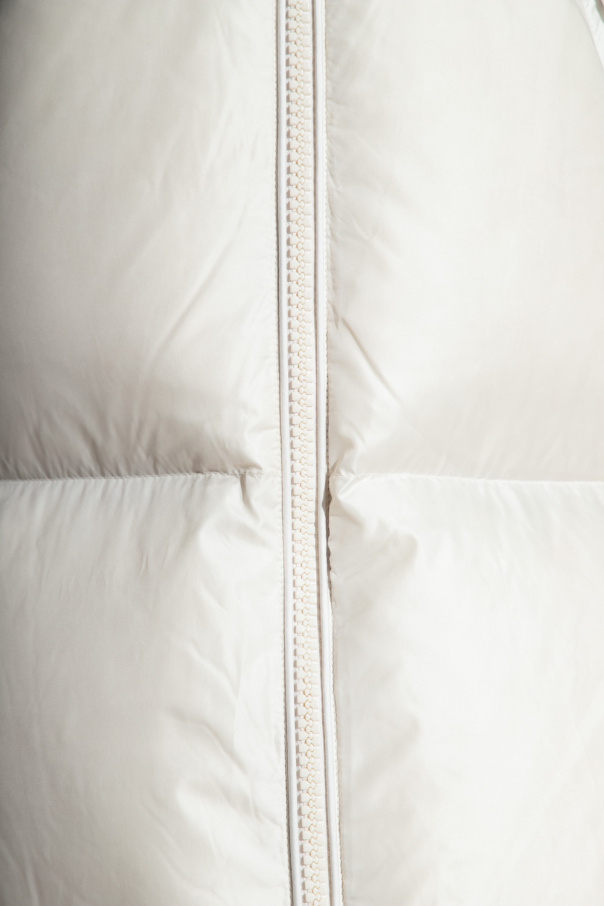 Cream quilted hooded down vest from Yves Salomon, the ‘Army’ line. Fastened with a zip, this garment features drawstrings on the inside, collar with detachable lamb fur, two snap-fastened front pockets and detachable hood. Has insulating properties up to -20°C.