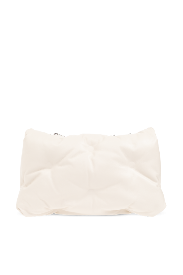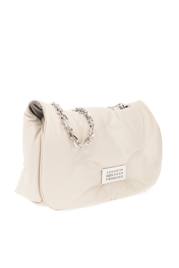 Greyish cream ‘Glam Slam Medium’ quilted shoulder bag from Maison Margiela. Made of leather, this design features snap fastenings, a logo patch, double chain, silver-tone metal hardware and one internal compartment with one zip pocket.
