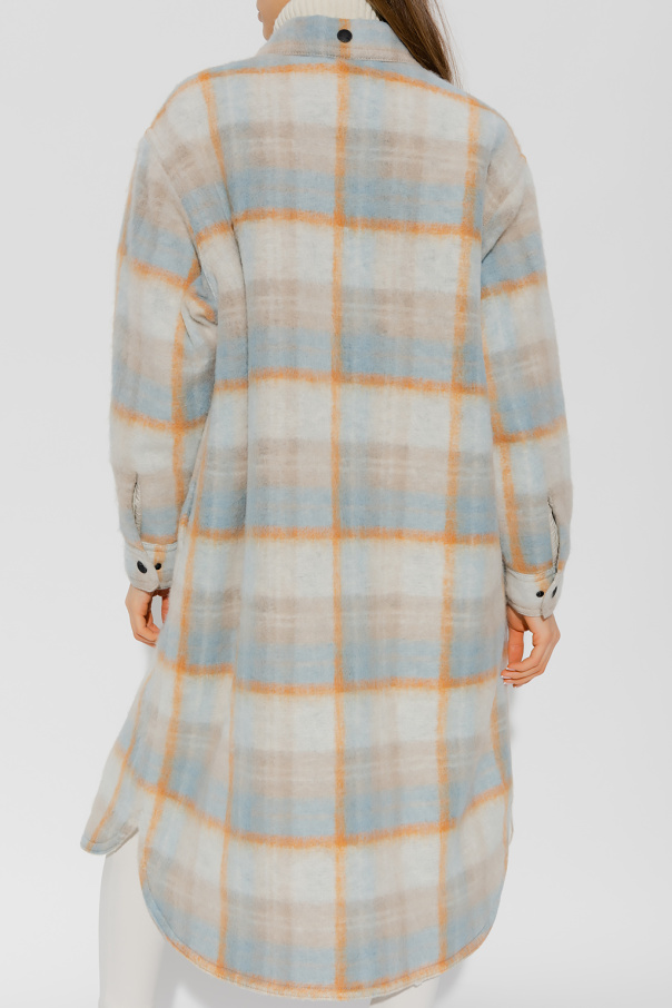 Beige, blue and orange ‘Vanay’ coat from Moncler Grenoble, the ‘Moncler Grenoble Apres-Ski’ collection. Crafted from a wool blend with an oversize silhouette, this style showcases a check pattern, a logo patch, snap closures on the front, four snap-fastened pockets – two with flaps, and long sleeves with cuffs.