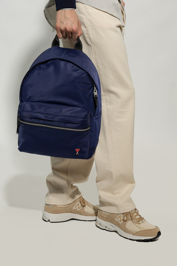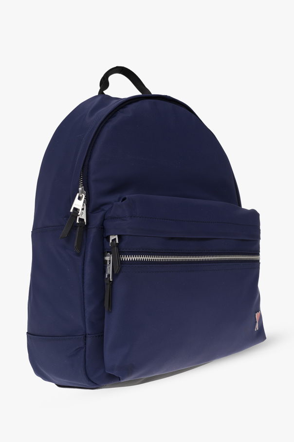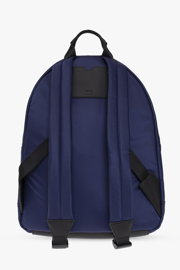 Navy and black backpack from Ami Alexandre Mattiussi. Made of fabric with leather trims, this design features a two-way zip, front zip pocket, silver-tone and red logo detail, back pocket, half-round handle, adjustable shoulder straps, silver-tone metal hardware and one internal compartment with one slip pocket.