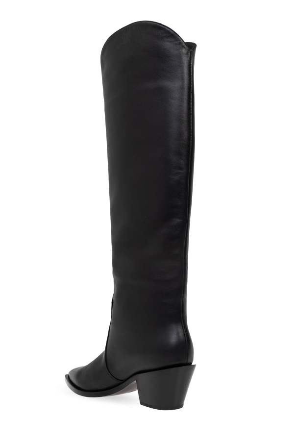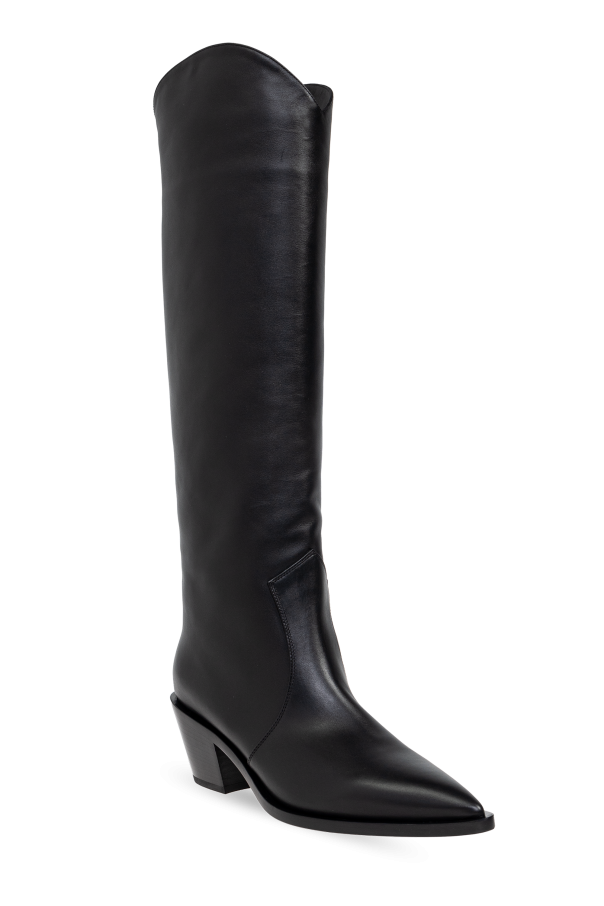 Presenting the Denver Knee-High Cowboy Boots – the essence of elegance and sophisticated style. These exceptional boots from renowned designer Gianvito Rossi are crafted for those who appreciate luxury and classic design. Made from the highest quality calfskin leather, both on the outer layer and inside, they guarantee exceptional comfort and durability. The solid black color and absence of additional patterns make these boots easily adaptable to any elegant outfit. The Denver boots feature a high shaft reaching the knees, a classic cowboy shape with a slightly pointed toe, and a medium-height cone-shaped heel that adds subtle elegance and stability. An additional advantage is the contoured upper edge with a characteristic \"V\" shape cutout. Without visible zippers or fastenings, these slip-on boots offer not only convenience but also an elegant and neat appearance. Why buy this product? Exceptional quality of materials – calfskin leather. Elegant design – classic cowboy style. Comfort of wearing due to excellent contouring. Slip-on fastening – convenience and simplicity of use. Stable heel – the perfect combination of elegance and functionality.