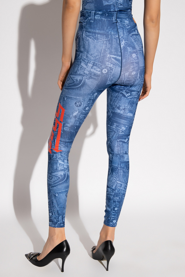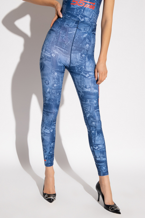 Blue 'AWSB-ROOWI-WT26' leggings from Diesel, the 'Sport 55DSL' collection. Embellished with a photographic denim motif accompanied by a red logo print, they feature an elasticated waistband, a back brown patch and narrow legs.