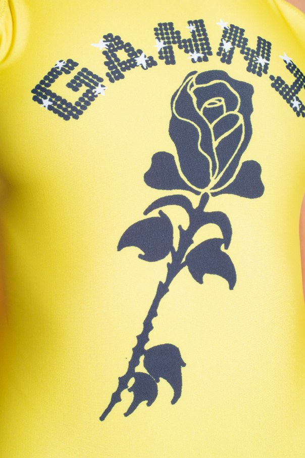 Yellow one-piece swimsuit from Ganni. This design is enriched by a floral print, white and black logo and low cut back.