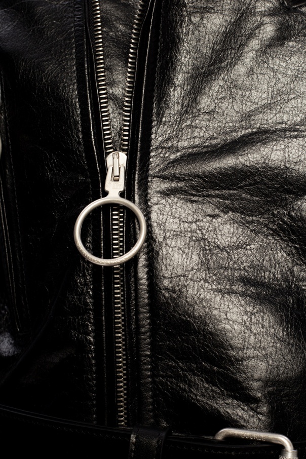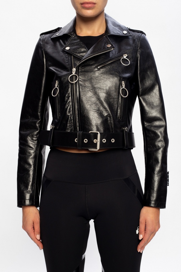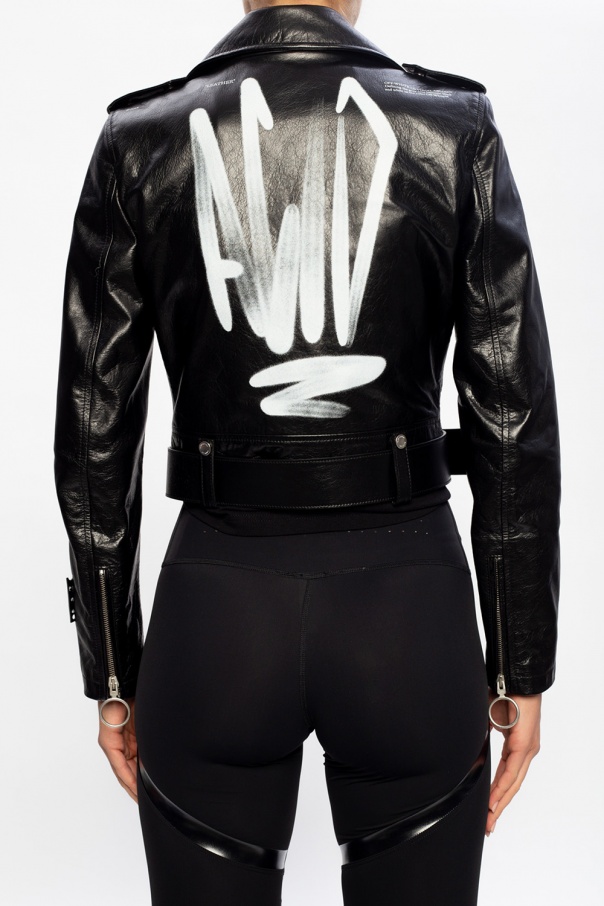 Black biker jacket from Off-White. Printed on the back with the label\'s signature motif in white, this leather-crafted style employs zip fastening, three zipped pockets and silver-tone metal fittings.