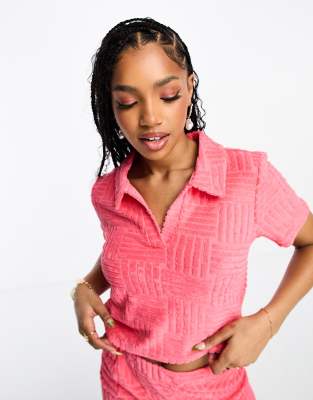 Pieces towelling shirt and mini skirt co-ord in hot pink
