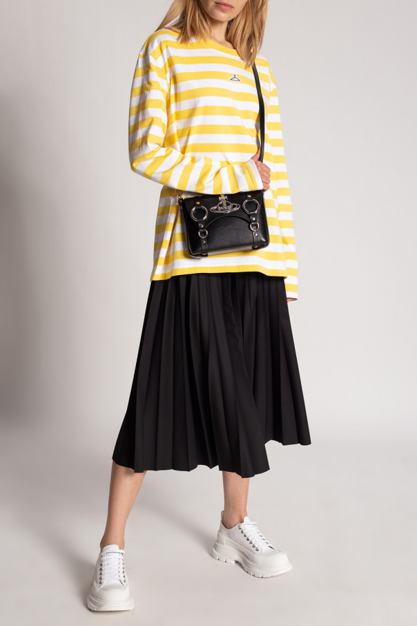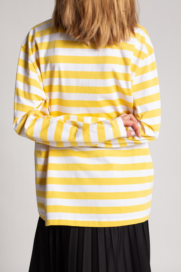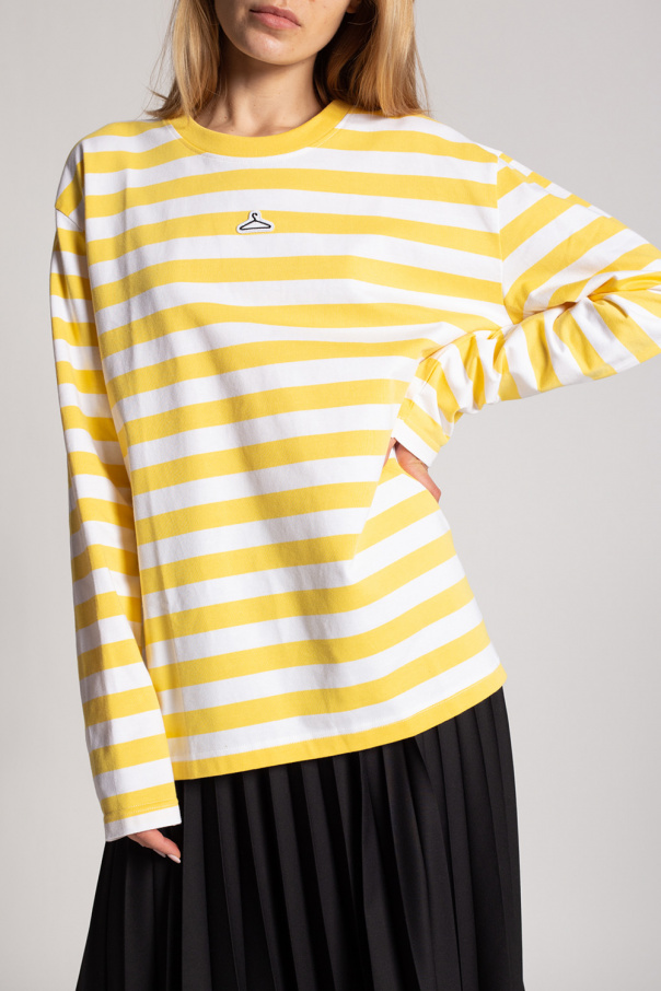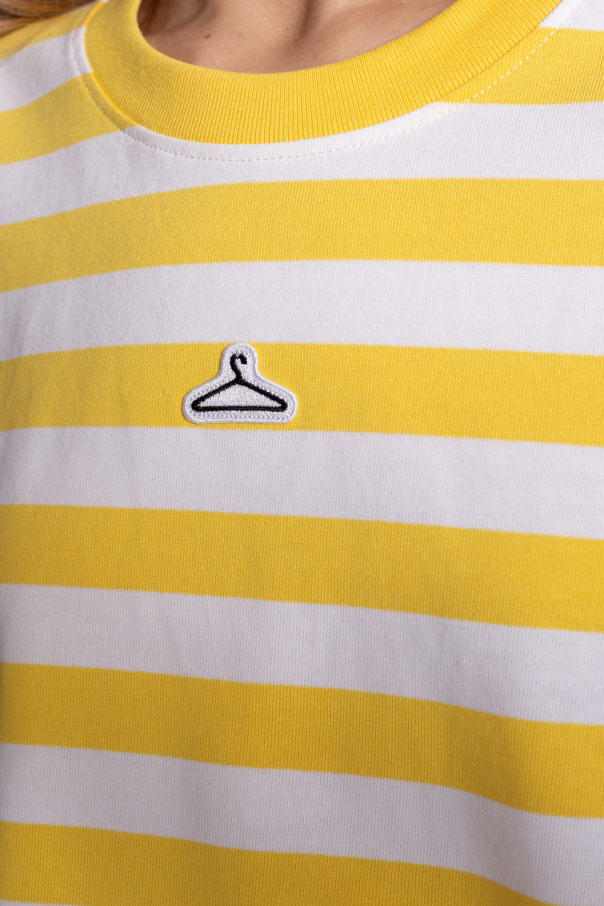 White and yellow crewneck T-shirt from Holzweiler. Crafted from organic cotton with all-over stripes, this style features long sleeves, rib detailing on the collar and a black and white logo patch.