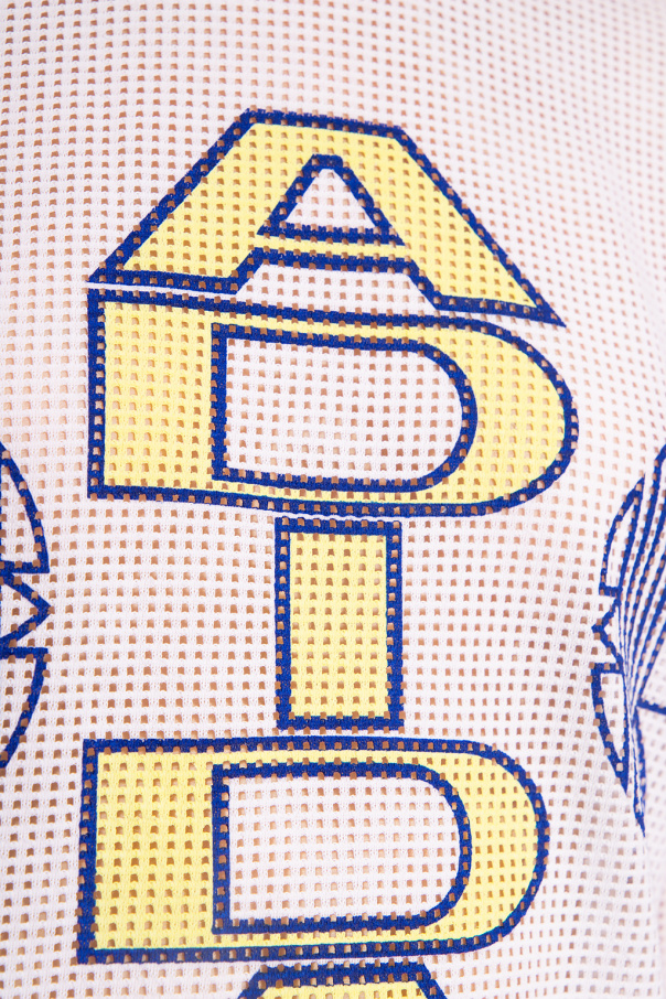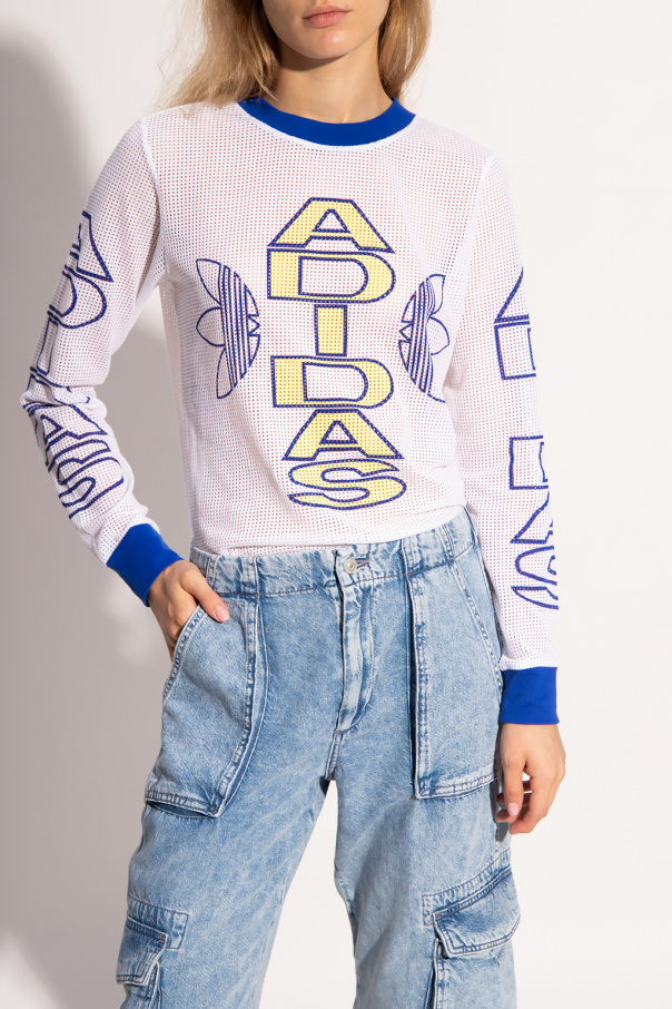 White mesh T-shirt with long sleeves from ADIDAS Originals. Made from recycled fabric, this design features a round neck, ribbed cuffs and a logo print in dark blue and yellow.