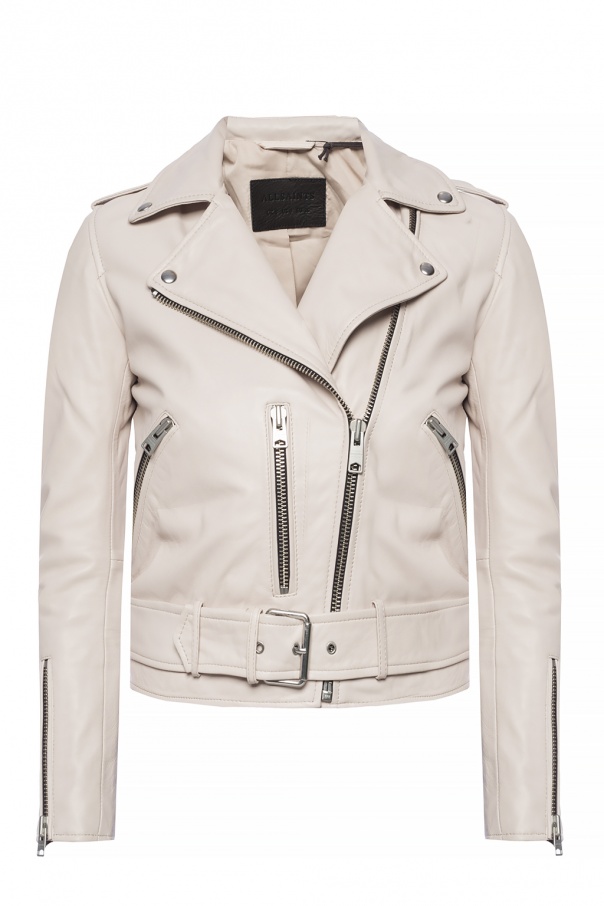 Cream ‘Dalby’ jacket from AllSaints. Made of lamb leather. Fastened with zip. Features zipped cuffs and 2 zip pockets on the front.