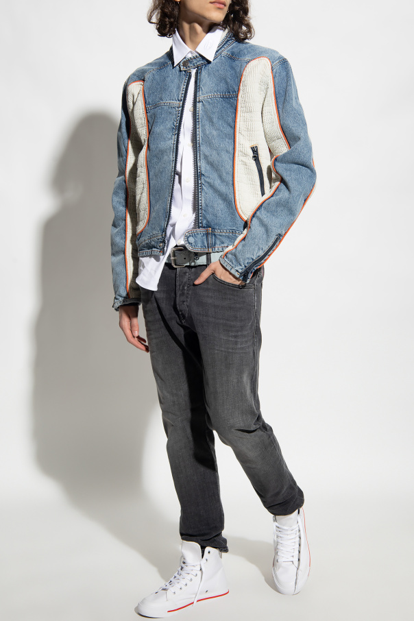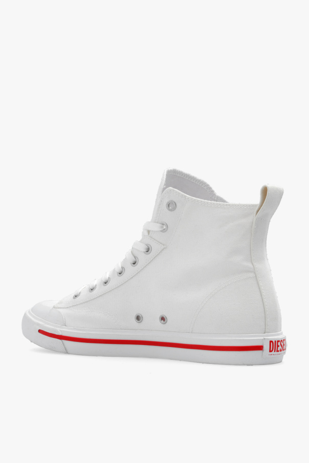 White ‘ATHOS S-ATHOS MID’ high-top sneakers from Diesel. Made of cotton, this lace-up pair features a red logo embroidery on the side and rubber sole in brown, white and red.