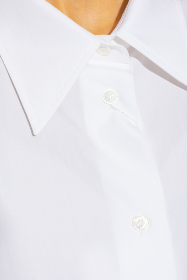 White shirt dress from Maison Margiela. Made of cotton, this style features button fastenings, a slip chest pocket and long sleeves with button cuffs.