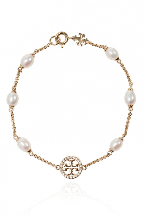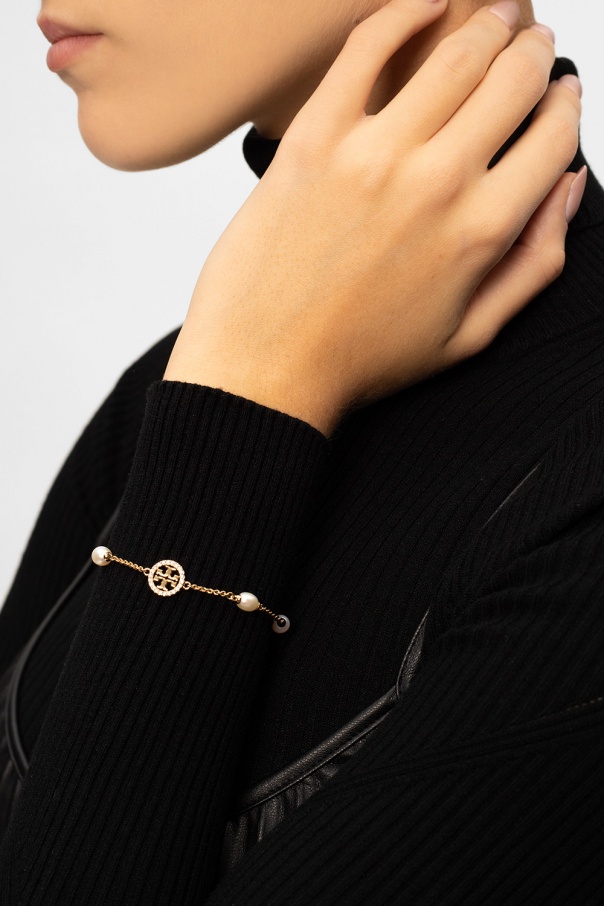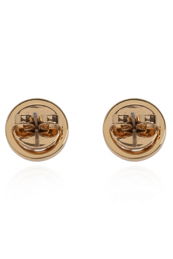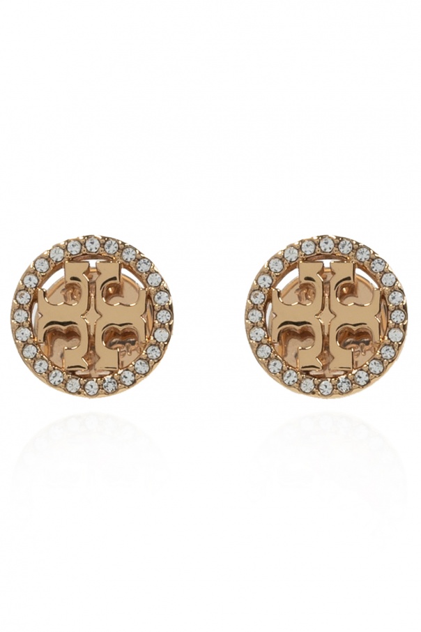 Brass set including a bracelet and earrings with logo appliqués from Tory Burch.