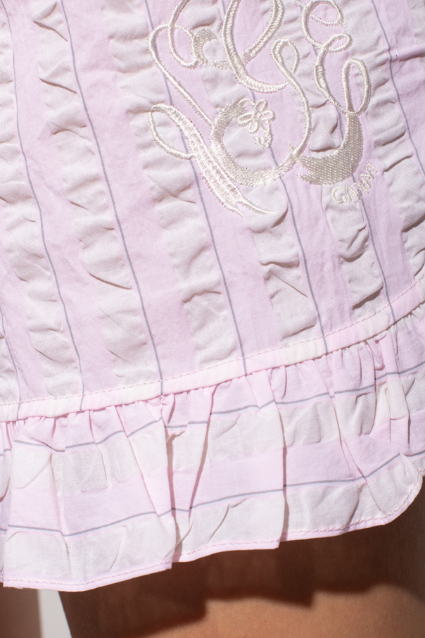 Light pink, cream and grey ruched shorts from Ganni. Made of cotton, this pair features an elastic waistband, stripe pattern, logo embroidery, side slits and ruffle trims.