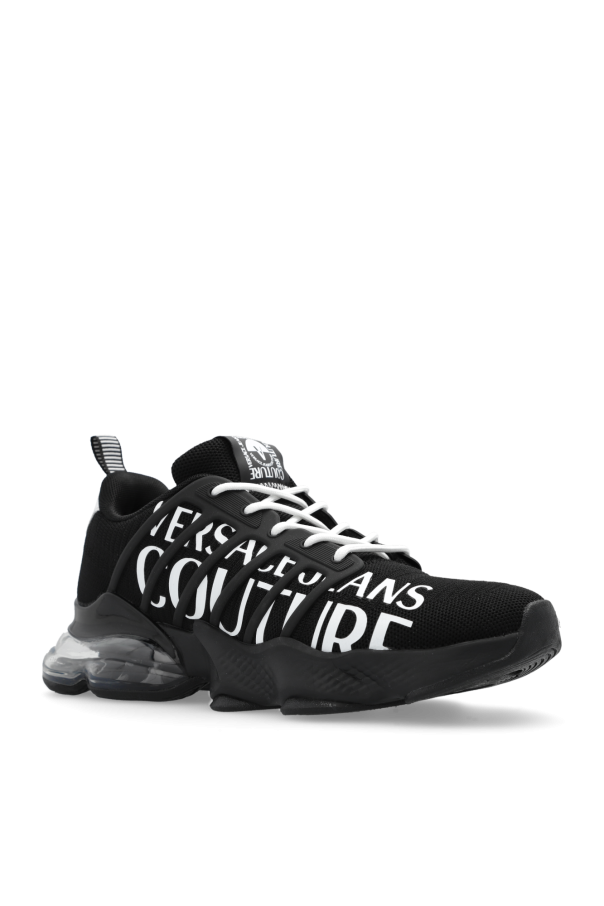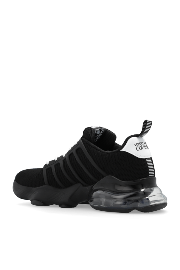 Black and white sneakers from Versace Jeans Couture. Made of fabric, this lace-up pair features a logo detail and black rubber sole with a transparent insert in white.
