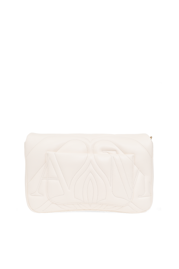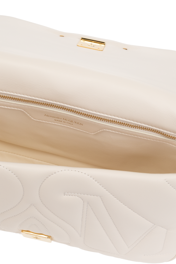 Cream ‘Seal’ shoulder bag from Alexander McQueen. Made of lamb leather, this model features a snap fastening, quilted pattern, metal logo appliqué on the front, slip pocket on the back, short chain, gold-tone metal hardware and one internal compartment with one zip pocket.