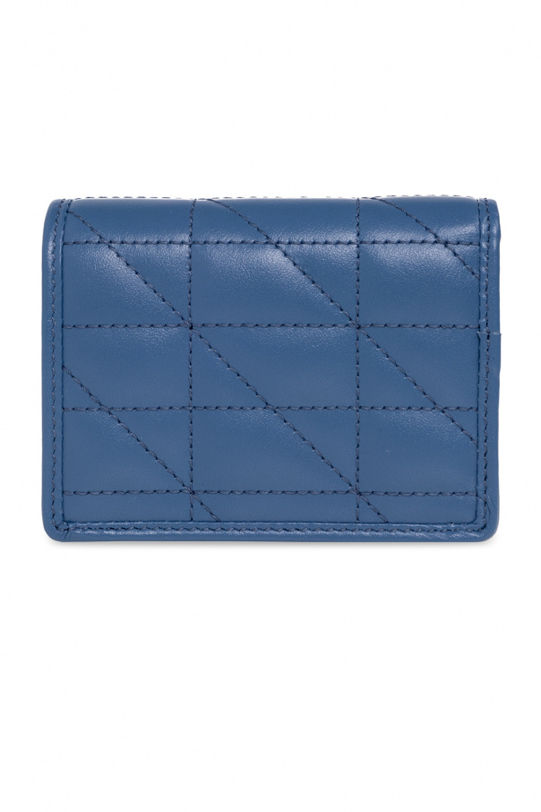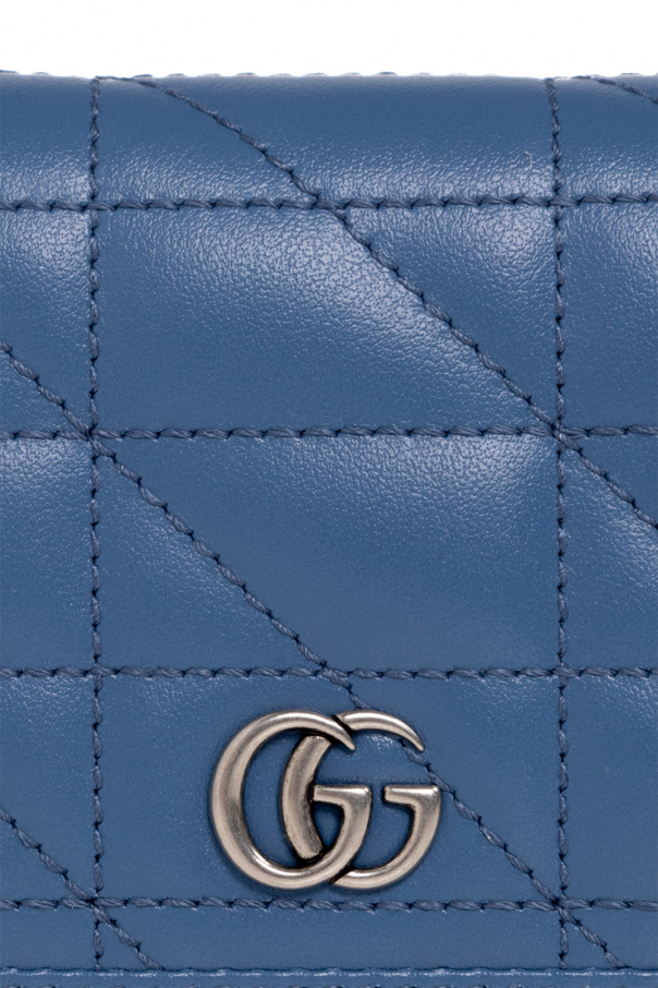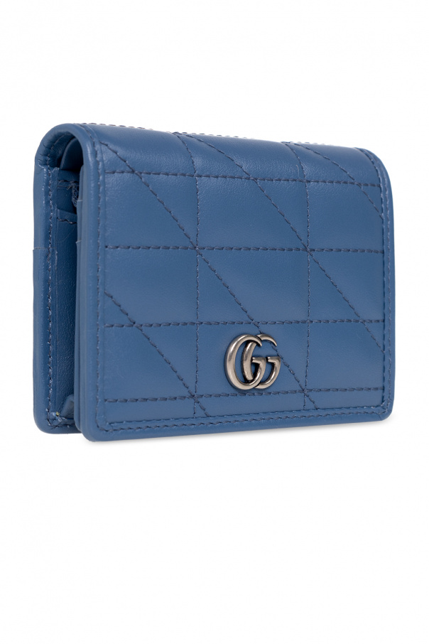 Blue quilted wallet from Gucci. Made of leather, this item features a snap closure, metal logo appliqué and silver-tone metal hardware. It has a zipped coin pocket, bill compartment and six card slots inside.