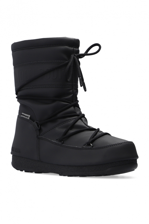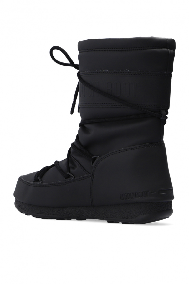 Black ‘Mid Rubber’ snow boots from Moon Boot. Fastened with decorative laces, this pair is complete with a raised logo and black rubber sole. Inspired by the peculiar shape and technology of the astronauts’ boots, the iconic style was designed in 1969 after the first Moon landing.