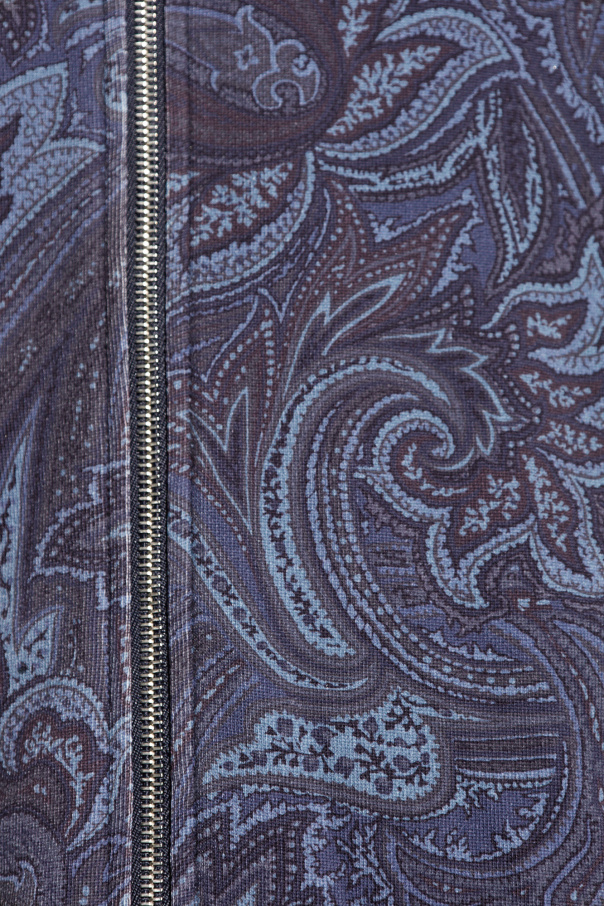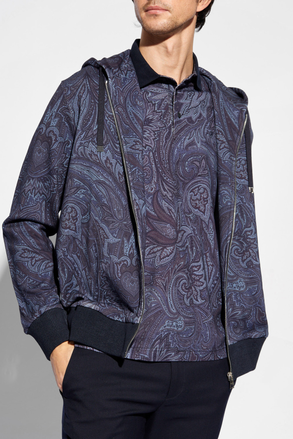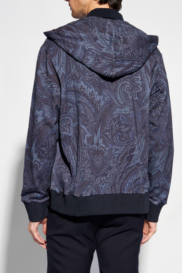 Navy hoodie from Etro. Made of cotton, this garment features a zip fastening, multicolored paisley print, drawstring hood and ribbed trims at the hem and cuffs.