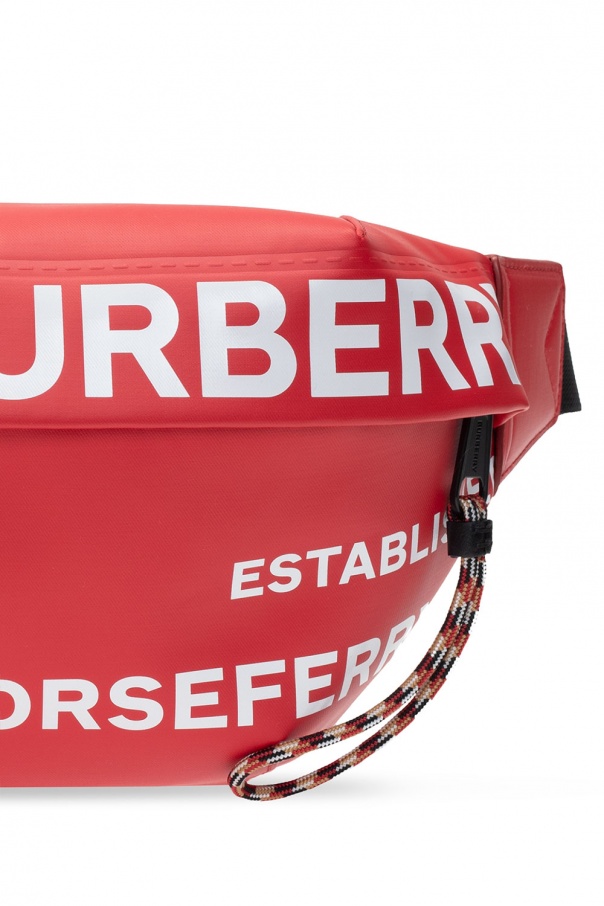 Red and black belt bag from Burberry. Printed with the brand's logo in white, this cotton-crafted design fastens via a zip and employs an external zip pocket on the front, an adjustable strap and interior with one compartment and a card slot.