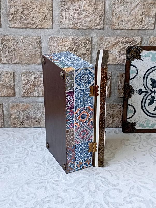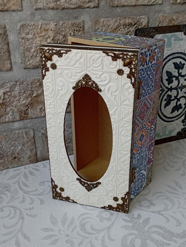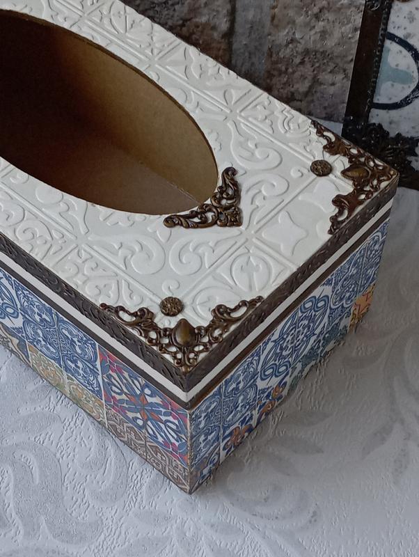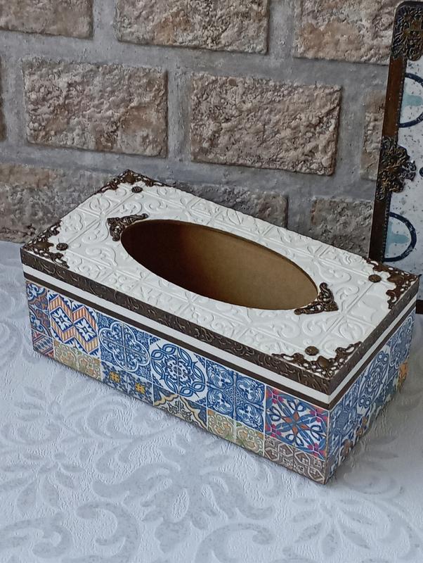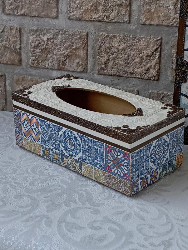 Салфетница декорирована с использованием художественных техник, украшена гранями ручной работы и объемным декором.