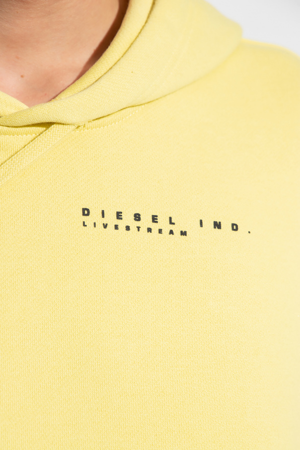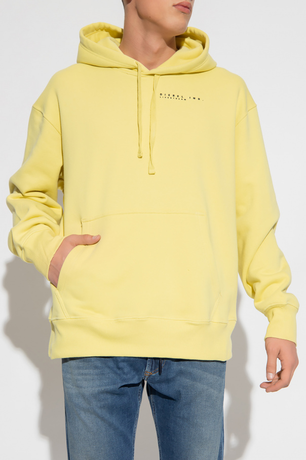 Yellow ‘S-MACS’ hoodie from Diesel. Crafted from cotton, this garment features a drawstring hood, black logo print, multicolored print with a metallic finish at the back, slip pocket and ribbed trims at the hem and cuffs.