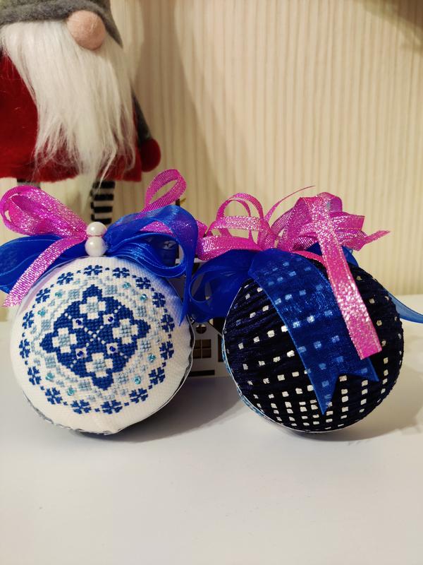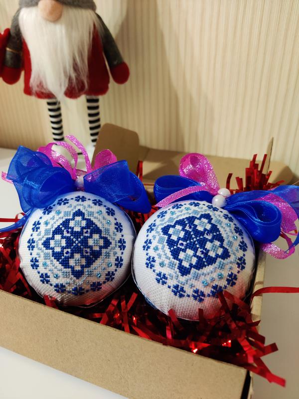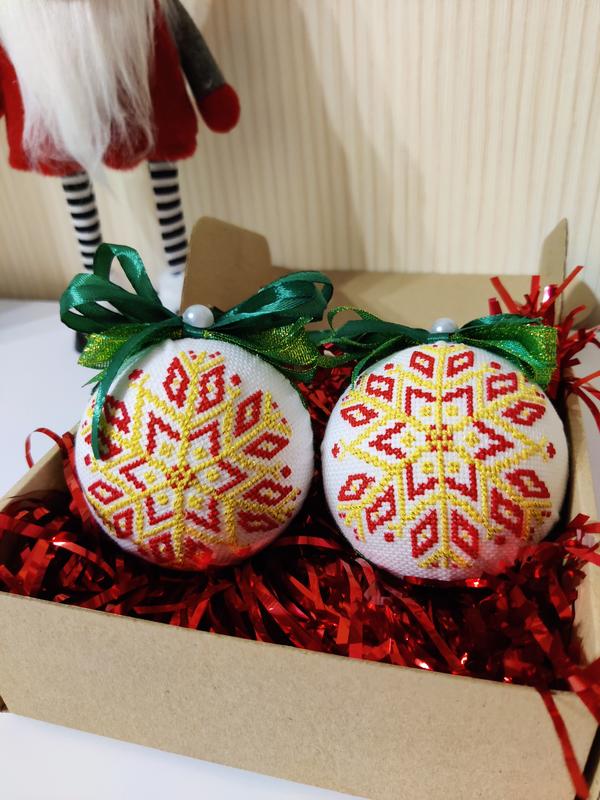 Кожна іграшка з однієї сторони містить вишитий хрестиком малюнок, з іншого кулька декорована тканиною. Сторони оздоблені стрічкою.Такі новорічні прикраси стануть чудовим подарунком для рідних та близьких, або ж прикрасять Вашу святкову оселю.