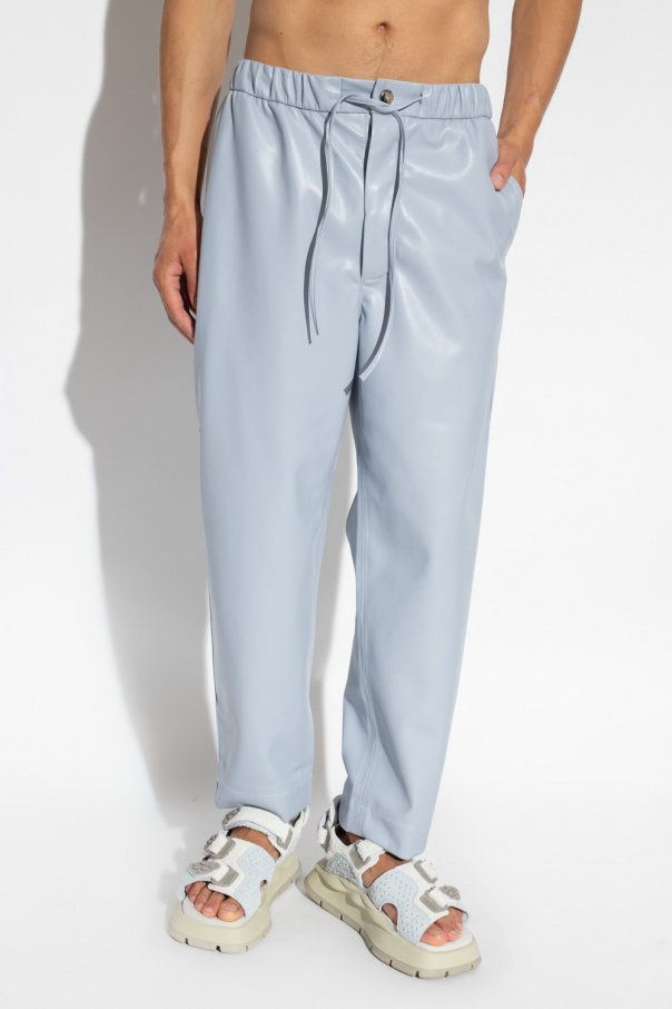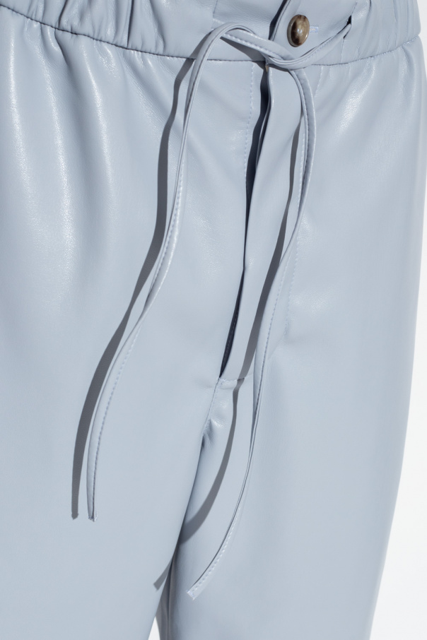Light blue ‘Jain’ trousers from Nanushka. Crafted from the brand\'s signature OKOBOR™ vegan leather, this pair features a relaxed silhouette with a drawstring waistband and three slip pockets. Exclusive to Nanushka, OKOBOR™ is new alternative to leather, with 100% recycled backing and a more responsible composition.